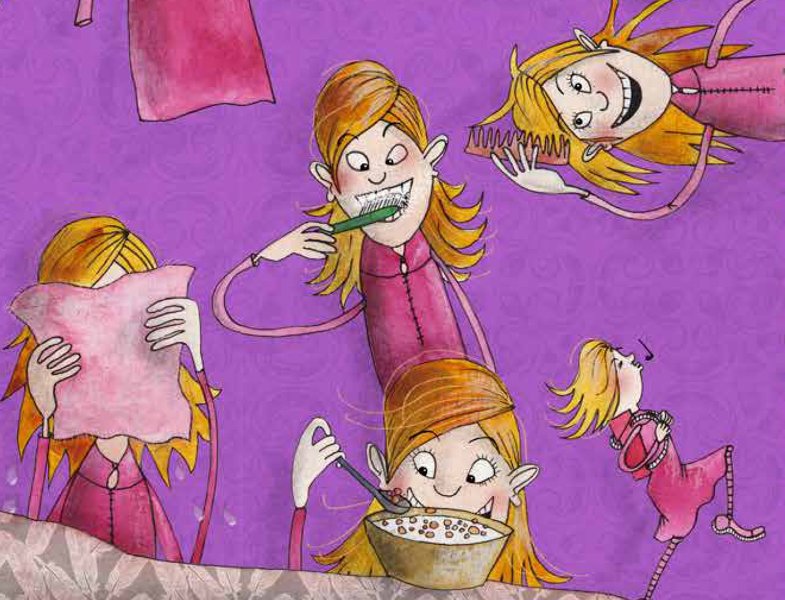Bed, hair, teeth, face, breakfast, school, wake up, get dressed, make my bed, comb my hair, brush my teeth, wash my face, have breakfast, go to school.