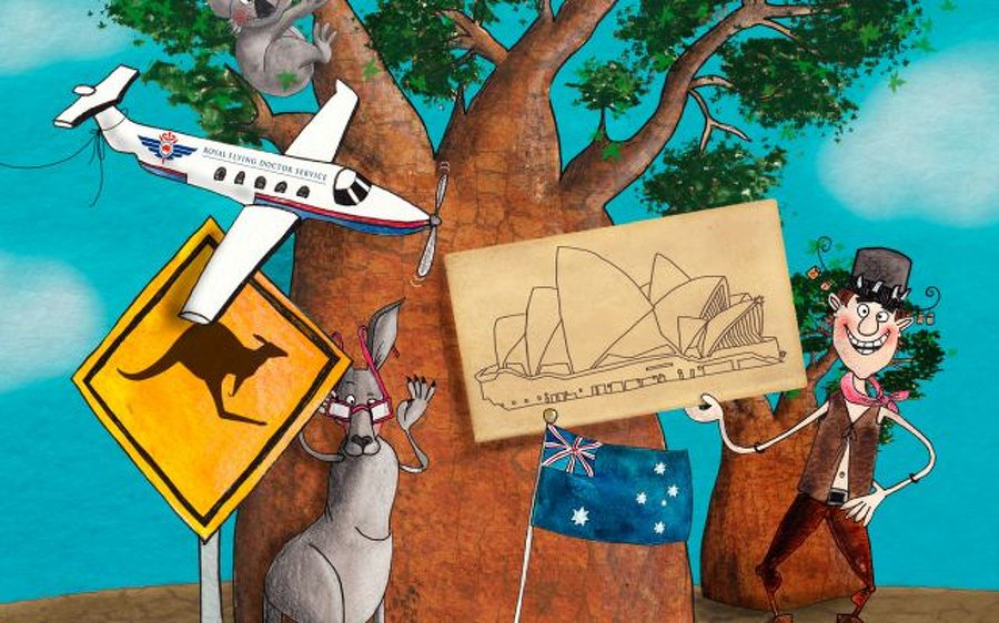 Vi tager først en tur til Australien, hvor vores familie denne gang kommer fra. Mon ikke børnene kender kænguruer og boomeranger, men mon de ved, at lægerne i Australien af og til må flyve ud til deres patienter, fordi afstandene er så store? Der er nok at tale om.